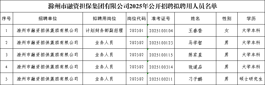 滁州市融資擔(dān)保集團(tuán)有限公司2025年公開招聘擬聘用人員公示