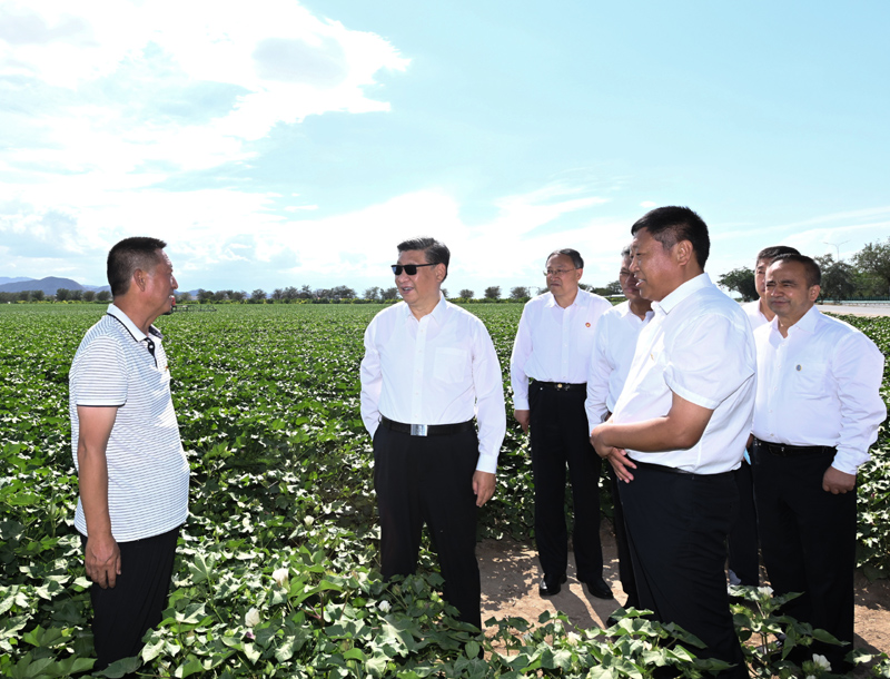 7月12日至15日,中共中央總書記、國家主席、中央軍委主席習近平在新疆考察。這是13日下午,習近平在新疆生產(chǎn)建設(shè)兵團八師一四三團農(nóng)一連棉花種植基地考察。新華社記者 謝環(huán)馳 攝