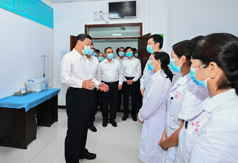 7月12日至15日,中共中央總書記、國家主席、中央軍委主席習近平在新疆考察。這是14日,習近平在吐魯番市高昌區(qū)亞爾鎮(zhèn)新城片區(qū)新城西門村黨群服務(wù)中心醫(yī)務(wù)室考察。新華社記者 燕雁 攝