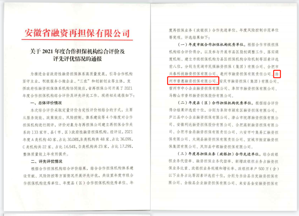 市普惠擔(dān)保公司榮獲安徽省2021年度市級合作擔(dān)保機(jī)構(gòu)優(yōu)秀單位